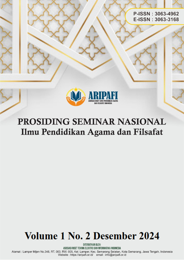 Prosiding Seminar Nasional Ilmu Pendidikan Agama dan Filsafat, It is a collection of scientific papers or articles that have been presented at the National Research Conference which is held regularly every year by the Indonesian Religion and Philosophy Education Research Association. The topics of the papers published in the Prosiding Seminar Nasional Ilmu Pendidikan Agama dan Filsafat are: (a). Religion, (b). Religion (Philosophy) of Hinduism, Buddhism and others not yet listed, (c). Sociology of Religion, (d). Other relevant fields and published twice a year (June and December).